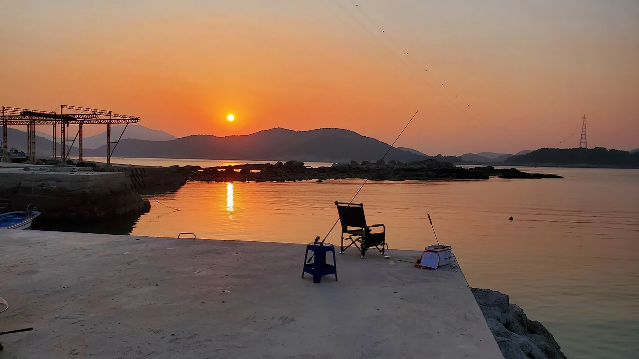 잡아 온 뿔소라를 망에 넣고 줄에 묶어 바닷속에 던져두었다. 그리고 물이 더 들어오기 전에 서둘러 물이 빠진 바위 위에 그물을 펼쳤다. 밤새 물이 들어오면 무거운 추가 달린 그물 한쪽에 바닥에 깔리고, 가벼운 스티로폼이 달린 그물 한쪽이 물 위로 뜨게 된다. 밀물에 따라 들어오는 물고기가 그물코에 걸릴 것이고, 우리는 내일 새벽 물이 빠진 이곳에서 그물을 걷어 물고기를 따 낼 것이다. 낚시로 잡지 못한 물고기를 보충하리라. 그물을 치고 나니 물이 들어오면서 수위가 높아지고 물 흐름이 바뀌었다. 대상어종인 볼락에 맞게 낚시채비를 바꾸고 자리를 옮겨 낚싯대를 드리웠다. 멀리 해가 떨어지면서 낙조가 사방을 붉게 물들여놓았다.
