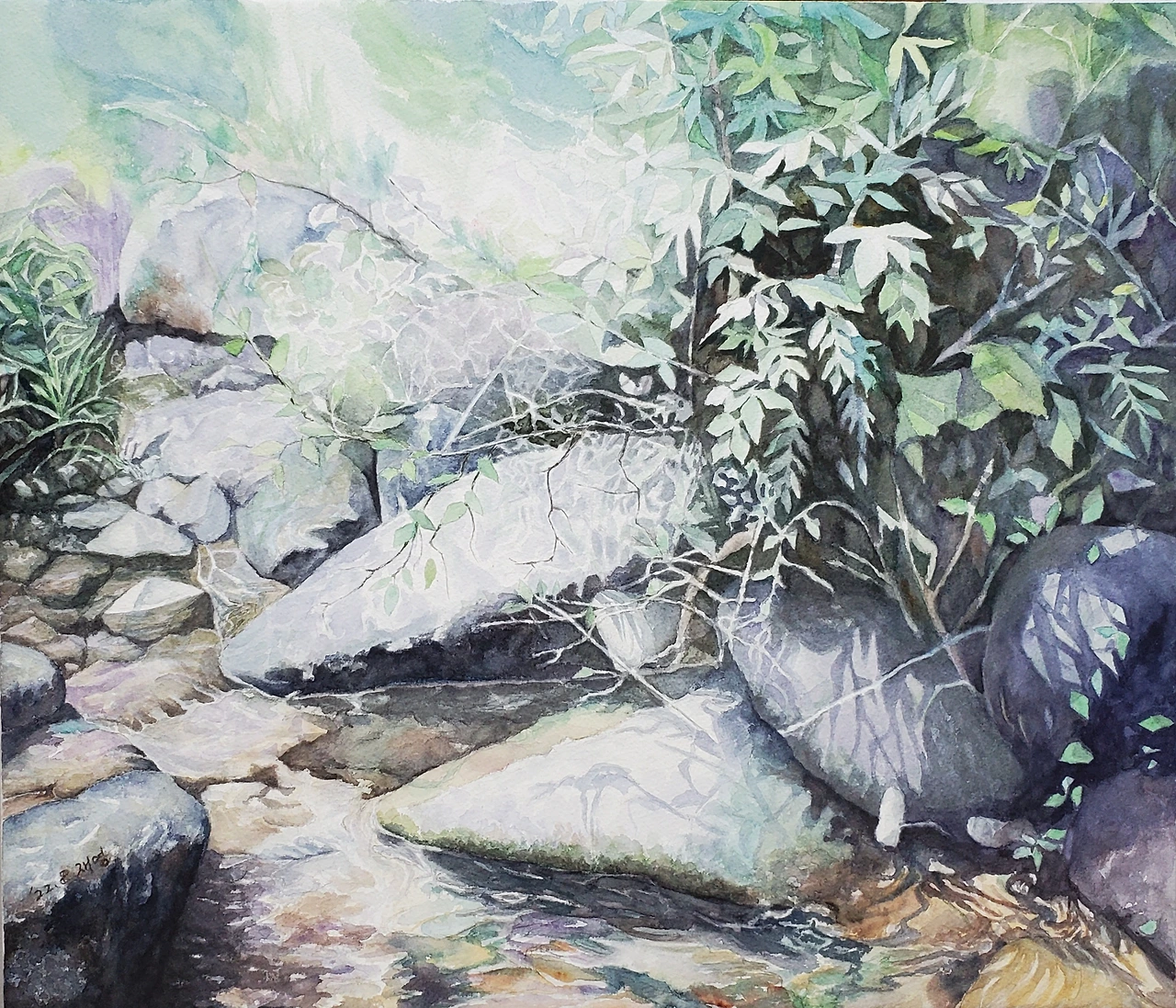 개울가 넝쿨의 잎사귀를 드러내고 그림자를 표시하고