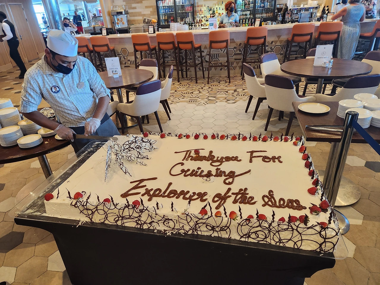 먹고 자고. 방으로 돌아와 다시 잠을 청하다. 12시 반에 일어나 다시 식당에 갔다. 마지막 날이라고 크루즈를 이용해 주어 감사하다는 글을 새긴 대형 케이크를 잘라 나누어 주었다. 왕갈비 바비큐와 치킨과 과일로 식사를 했다. 배가 꺼지지도 않았는데 습관처럼 점심을 챙겨 먹었다. 1주일 동안넘치도록 먹었으니 배에서 내리면 몇 kg이 늘었겠지. 가급적 빵과 케이크는 피하고 있지만 워낙 먹는 양이 많아서 걱정이다. 크루즈 배에서는 먹는 것과 음료가 차고 넘쳐서 스스로 식사량 조절이 필요했다. 원한다면하루 몇 번이고 먹을 수 있다. 선실 밖 복도와 크루즈 내 쉴 만한 공간이나 야외 선 배드 옆에는 고객들이 가져다 먹은 음식의 잔해들이 즐비했다. 반쯤 먹다만 피자, 치킨, 빵을 담은 일회용 접시와 음료수 컵들이 여기저기에서 뒹굴고 있다. 선사는 담당자를 지정해서 주기적으로 빈 접시와 컵을 수거해 갔다.
