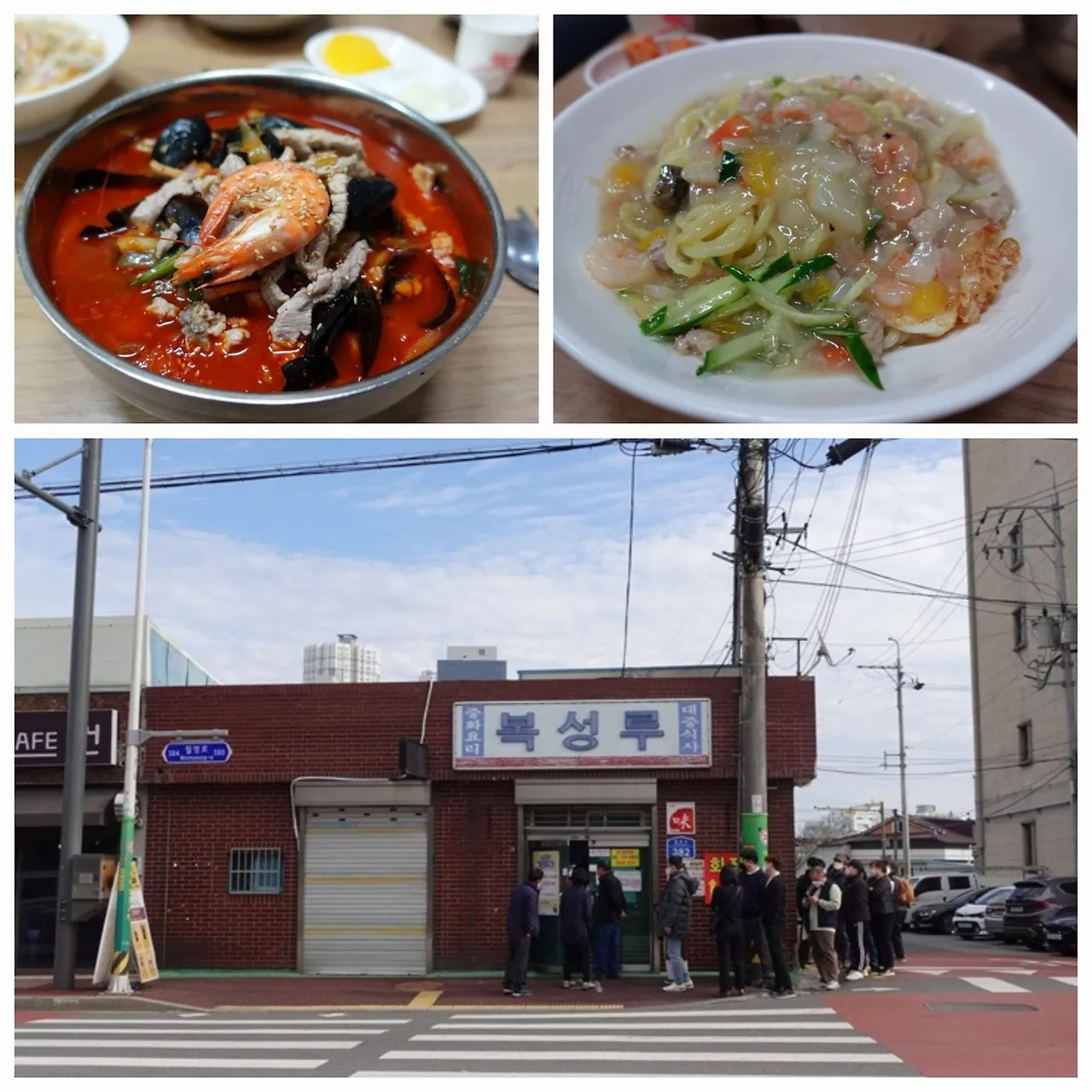 군산 유명 짬뽕집 복성루에도 들렸습니다. 허름한 집이었는데 젊은이들 뿐만 아니라 나이 든 분들도 줄을 많이 서 있었습니다. 동네 사람 분들도 오시나 보다는 생각에 특별한 맛을 기대했습니다. 식당 내에 6개쯤 되는 테이블에는 사람들이 차지하고 있어서, 방 안으로 들어갔습니다. 좁은 방 두 개가 이어져 있었고, 안쪽 방에는 아이와 젊은 부부, 그들의 부모로 보이는 분들이 땀을 흘리며 식사를 하고 있었습니다. 테이블 위에는 진한 붉은 국물을 가진 짬뽕 외에 해물이 섞여 있는 걸쭉한 맑은 국수가 쟁반에 담겨 있었습니다. 그래서 이 지역에서만 먹을 수 있다는 물짜장과 짬뽕을 주문했습니다. 물짜장은 울면에 해물을 조금 더 넣은 평범한 맛이었습니다. 짬뽕은 돼지기름으로 고춧가루를 볶은 듯 진한 국물 위에 기름이 떠 있었습니다. 돼지고기를 많이 넣은 것외 맛은 그저 그랬습니다. 맛에 비해 짬뽕 1만 원, 물짜장 1.1만 원은 비싸다는 생각이 들었습니다.
