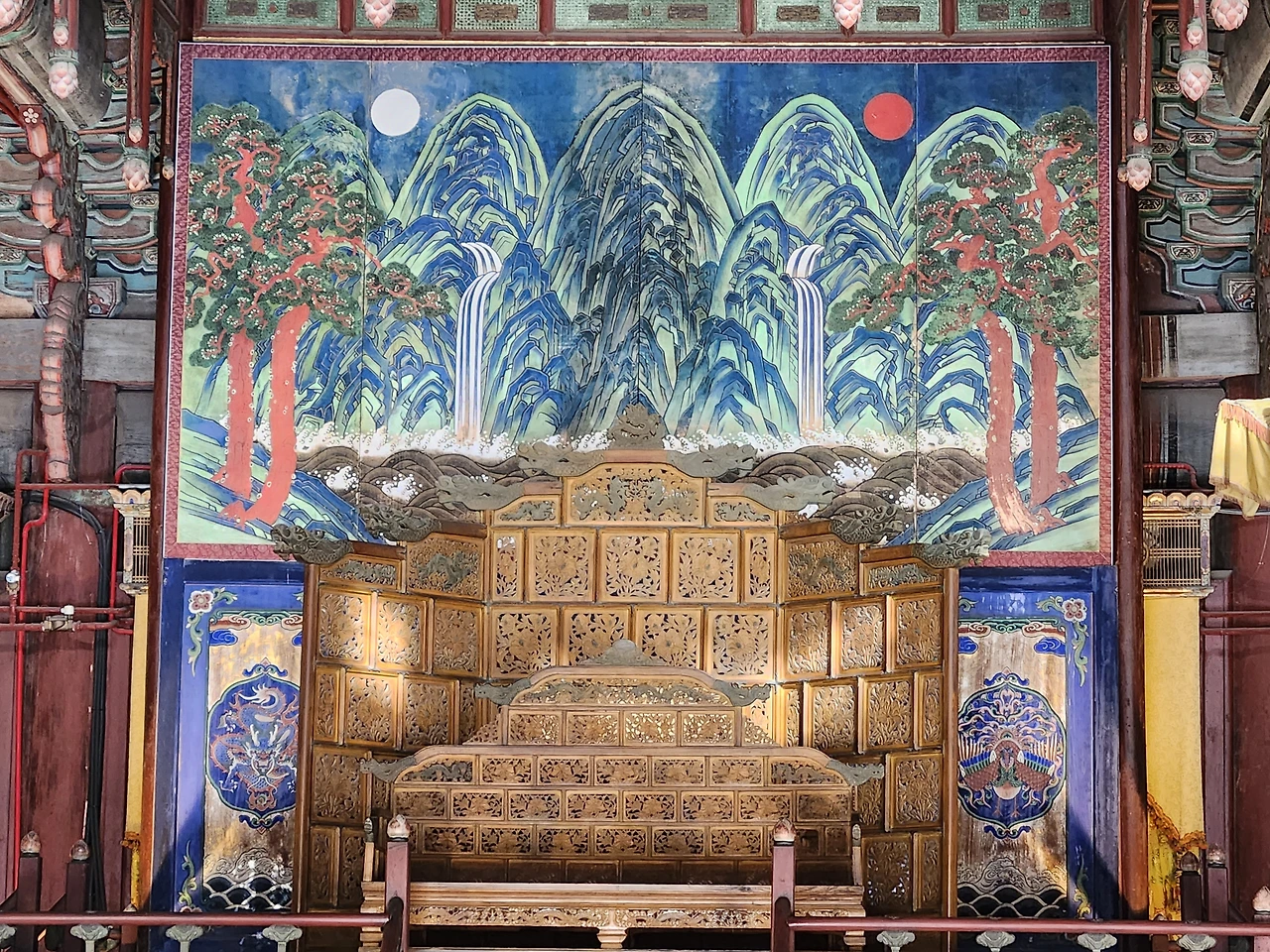 인정전 내에는 왕권의 권위를 나타내는 어좌와 일월오봉도가 놓여있다. 달과 태양, 다섯 개의 산, 소나무는 영원히 존재하는 왕권을 상징한다.