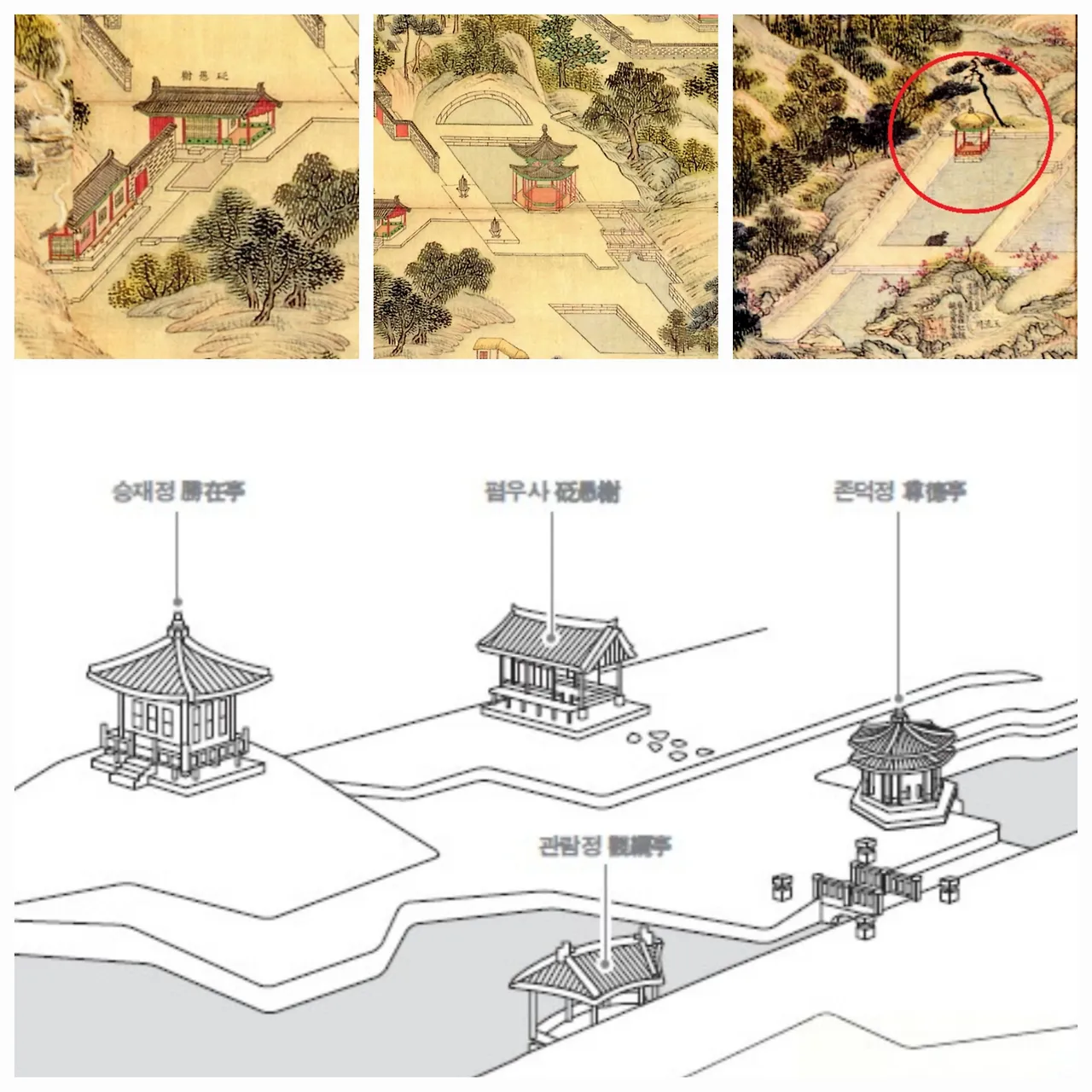 헌종 때 지은 동궐지에 그려져 있는 폄우사, 존덕정, 청의정