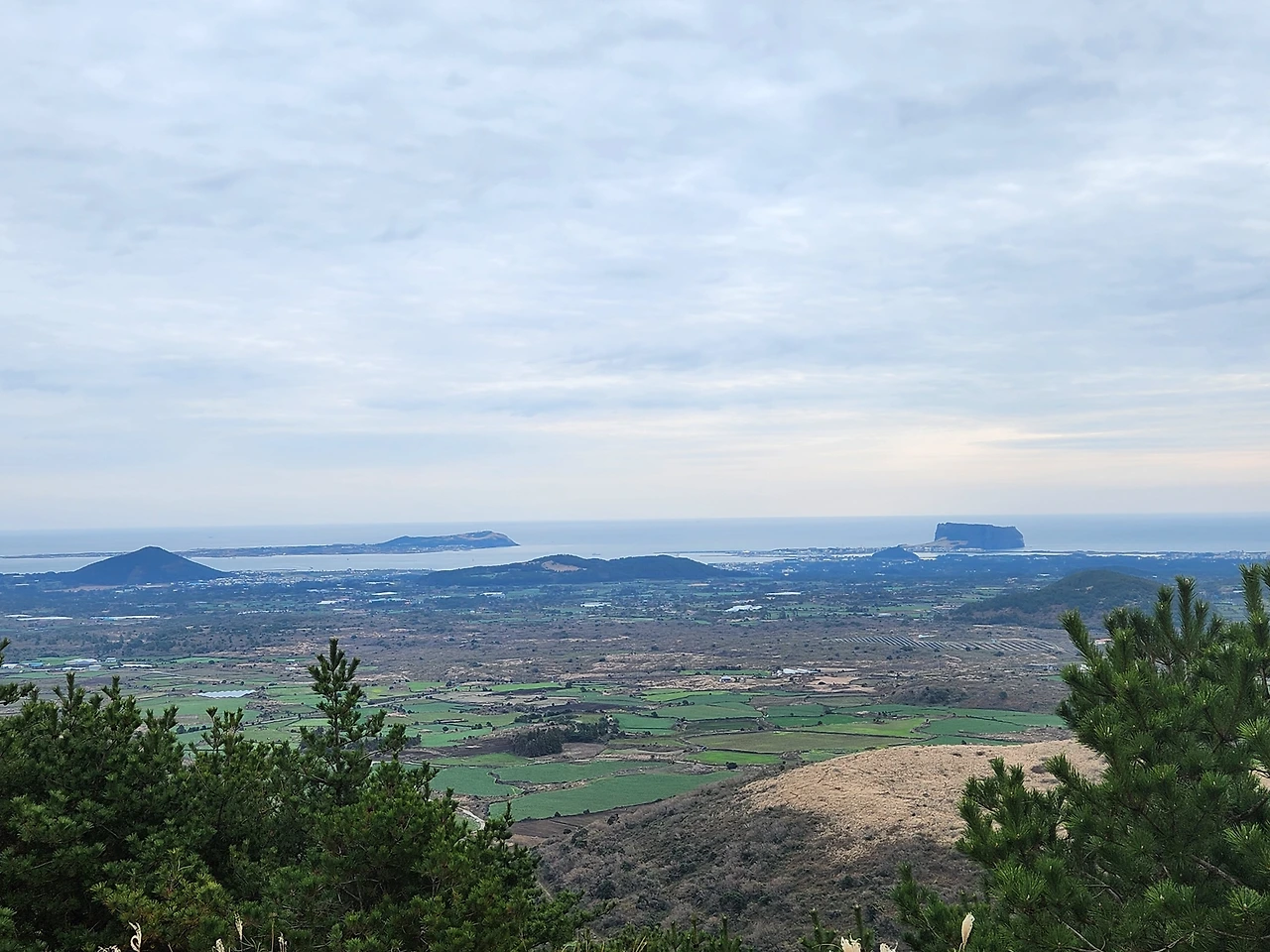 성산일출봉과 우도가 내려다 보이고 그 너머에는 하늘과 맞닿은 바다가 펼쳐졌다.