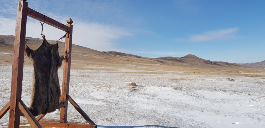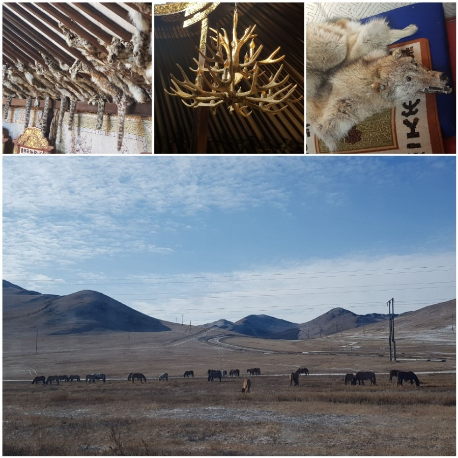 말들이 마른풀을 뜯고 있다. 광야에서 살던 사슴, 살쾡이와 늑대는 사냥꾼에게 잡혀 게르 내부를 장식하는 데 사용된다.