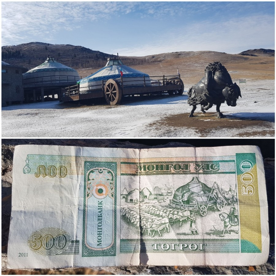 몽골 돈 500투그릭 지폐 뒷면의 그림. 게르를 통째로 마차에 태워 수십 마리 소를 끌어 옮긴다. 이동식 주택인 게르도 부와 권력이 보태어지면 이동 방식이 달라진다.