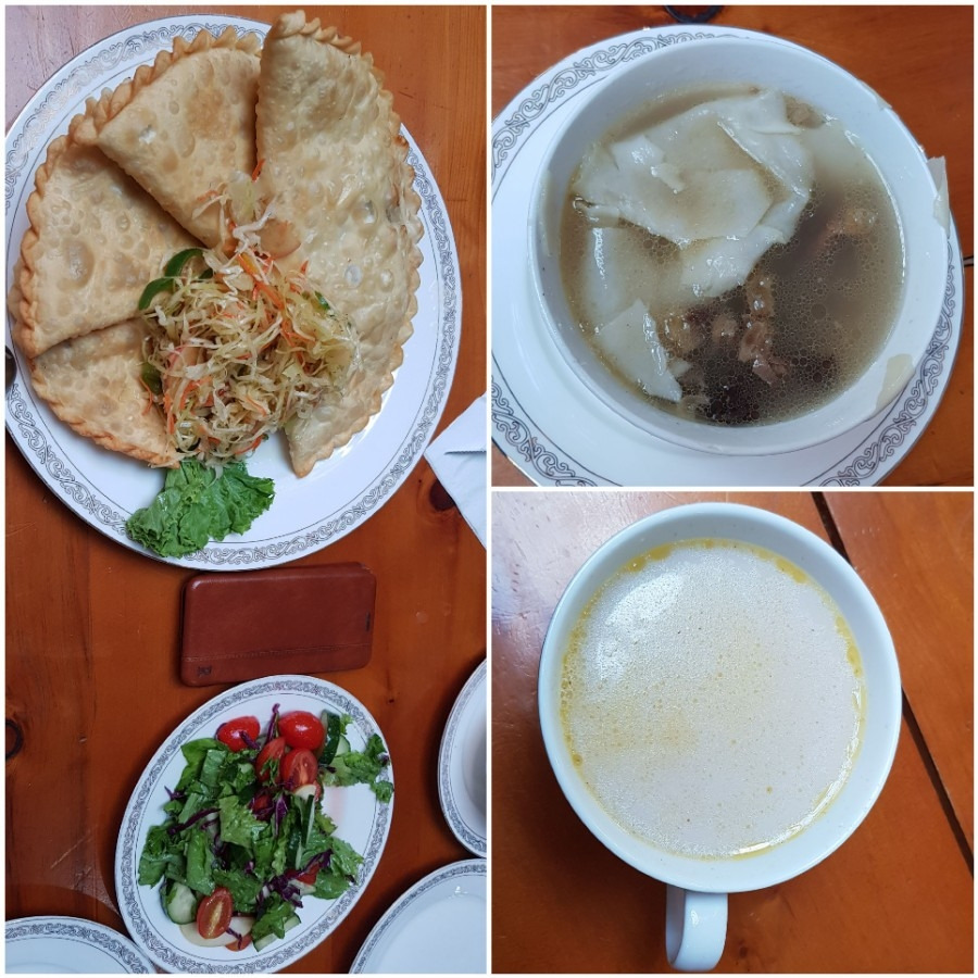 캠프 내 시설물과 주변을 한 바퀴 돌아본 다음, 점심식사를 위해 몽골 음식 몇 가지를 주문했다. 몽골식 만두 호쇼르. 크기가 큰 접시 반만 해서 하나만 먹어도 배가 불렀다. 휴대폰보다 두 배 이상이나 큰 만두피에 다진 고기만을 다져 넣어 튀겼다. 누린 맛을 소금에 절인 양배추로 간신히 감출 수 있었다. 가이드에게 집에서는 고기 외에 야채와 두부를 함께 넘어 만들어 보면 더 맛있을 것이라고 한국식 만두를 권해 보았다. 말린 고기에 물을 붓고 밀가루 피로 그릇 위를 덮어 큰 냄비에 넣어 중탕으로 끓인 브르츠(말린 고기를) 테(넣고) 비츠(밀가루로 덮은) 슐(국). 힘들고 지쳤을 때 어머니가 자주 끓여 주는 영양 국이라고 한다. 마치 서양의 치킨 수프와 같은 음식이다. 누린내가 많이 나서 먹기가 고역이었다. 수태차는 녹차에 우유를 붓고 끓이다가 말기름을 넣고 다시 끓여 만든다. 몽골인이나 관광객들이 가장 흔히 마시는 차로서 둥둥 떠있는 기름이 눈에 거슬린다. 맛은 역겹지 않아서 쉽게 마셔진다. 그리고 트으꺼(무릎 덮게) 니 슐, 우리나라의 도가니탕과 비슷한 음식을 주문해 먹었다.