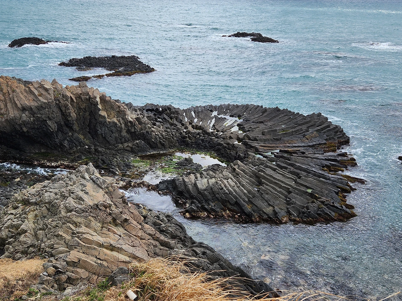 수평으로 누워있는 것이 일반적이나 읍천리 주상절리는 부채꼴 모양을 지니고 있어 특이하다.