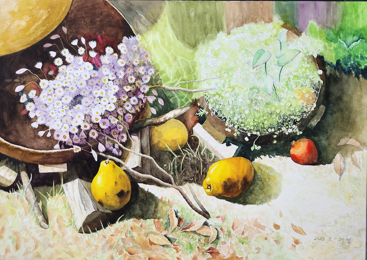 배경, 풀과 나뭇잎, 모과와 석류는 지난 경험을 살려 어려움 없이 그려 냈지만