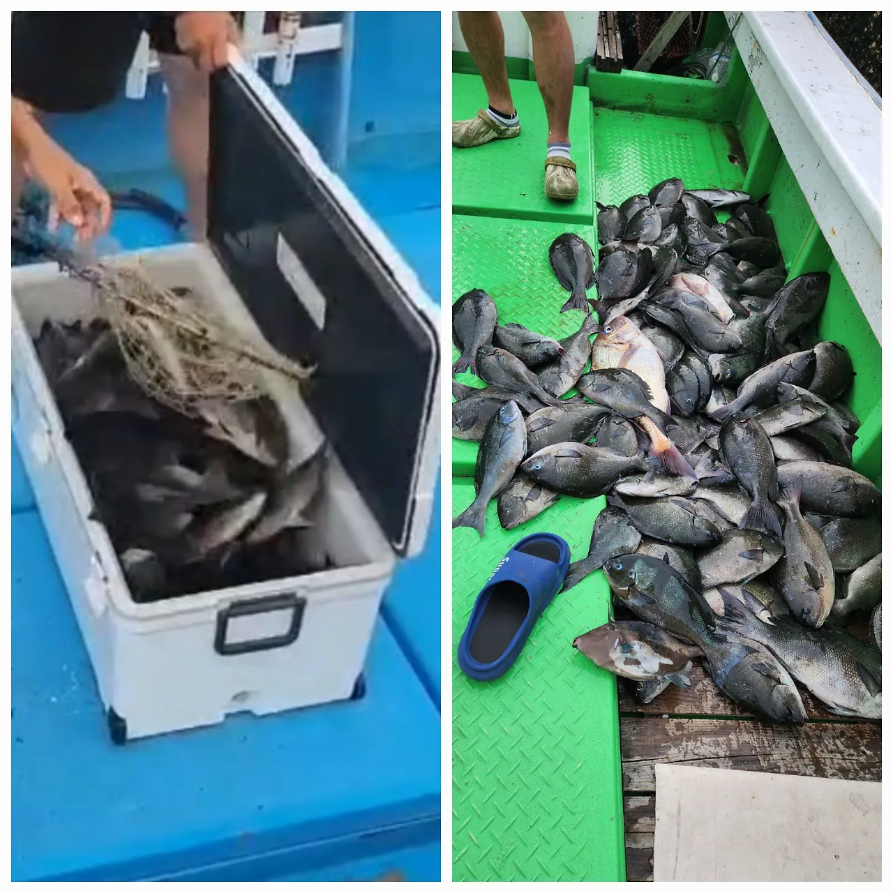 76리터 아이스박스 2개가 긴 꼬리 벵에돔으로 가득 찼다.