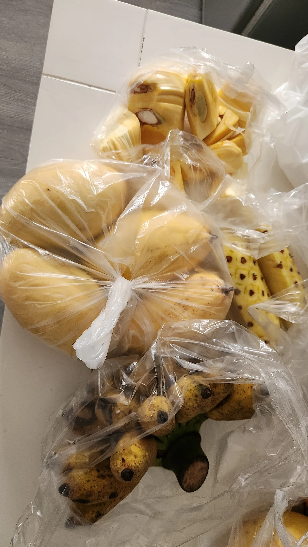 망고, 파인애플, 몽키 바나나과 잭푸릇 한 조각을 샀다.