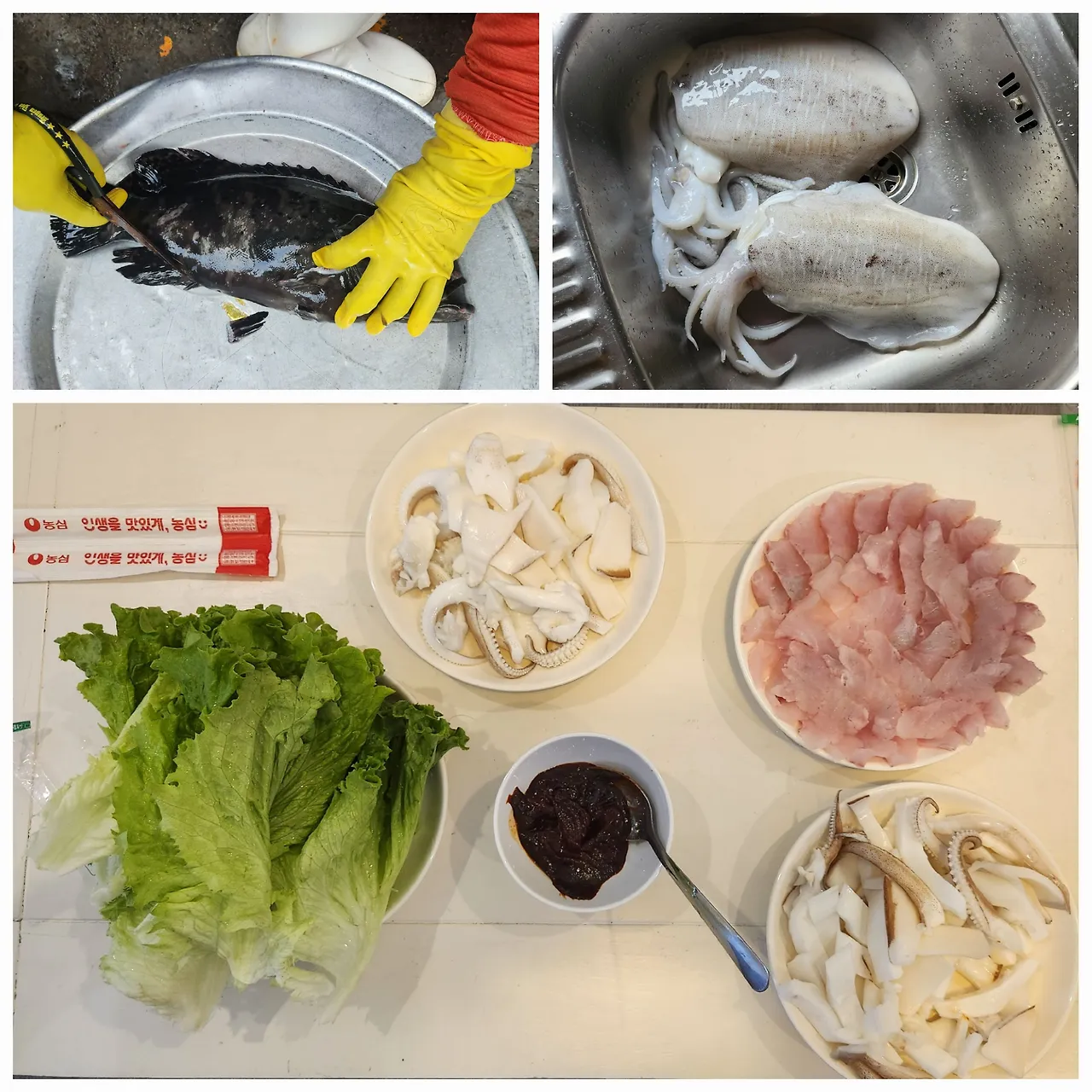 숙소에서 무늬오징어는 데치고 자바리는 회를 쳐서 옆방 친구들을 불렀다.