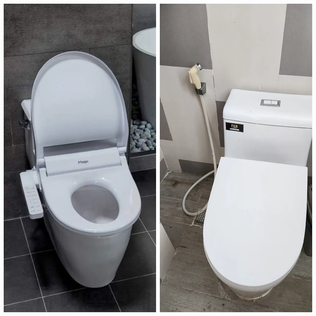 왼쪽은 우리가 평소 사용하는 별도의 비데, 오른쪽이 수도 배관에 직접 꼭지를 달아서 사용하는 베트남식 비데. 어느 것이 효율적일까?
