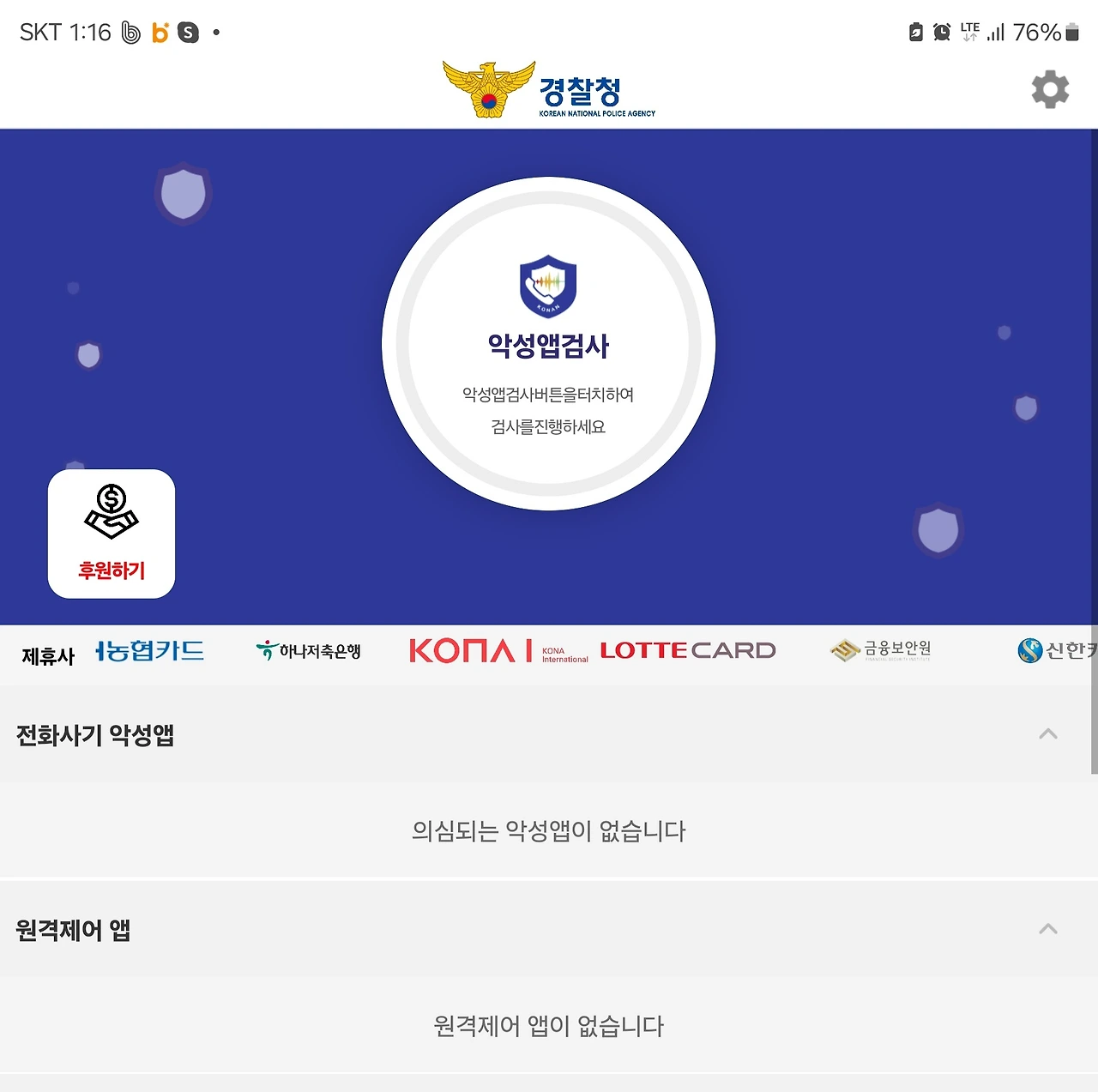 급히 경찰청에서 제공하는 '시티즌코난' 앱을 다운로드하여 악성앱의 설치 여부와