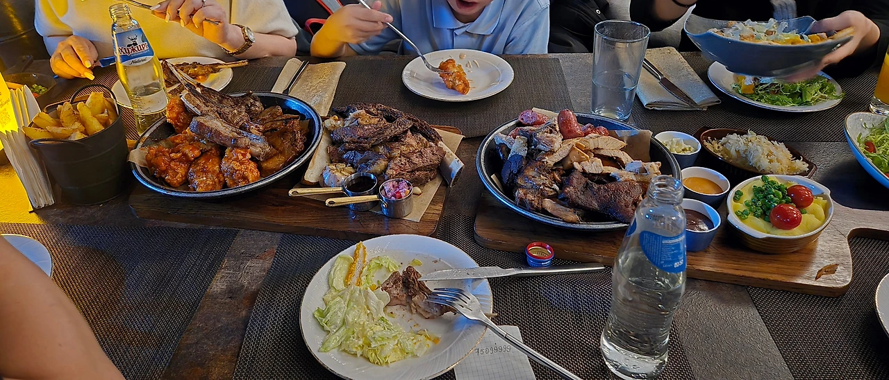 양념치킨, 양갈비구이, 쇠고기갈비, 돼지고기, 소시지와 감자튀김, 몇 종류의 야채 드레싱, 그리고 음료.