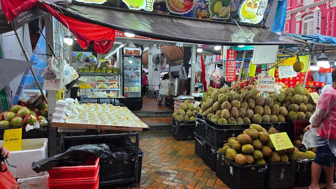 나는 두리안을 쌓아두고 팔면서 테이블에 앉아 먹을 수 있는 가게에서