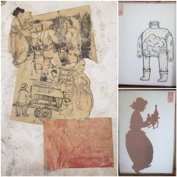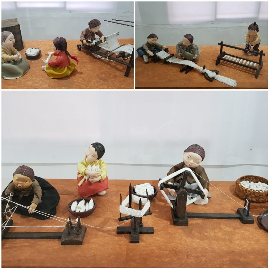 누에고치에서 얻은 실로 비단을 만들어 가는 과정을 닥종이 인형으로 재현했다.
