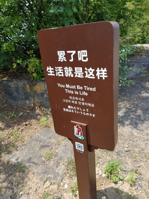 가파른 노야봉을 오르다 보면 나타나는 팻말. "피곤하시죠? 그것이 바로 인생이에요"