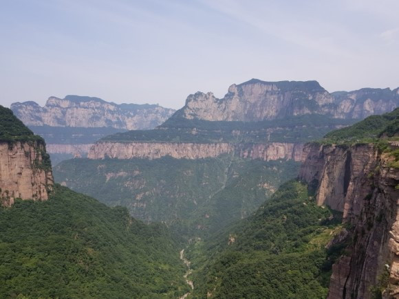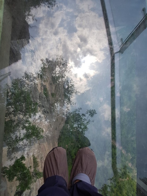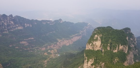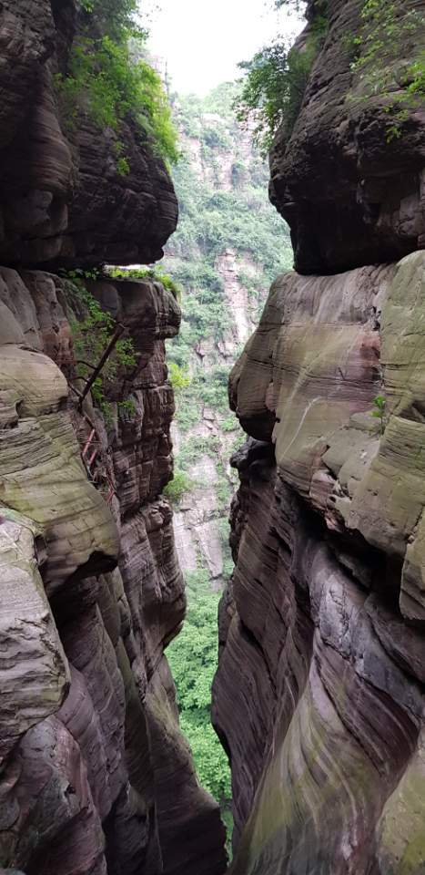 천계산 정상은 둥근 봉으로 이루어져 있어 사방에 구름이 내려앉은 봉우리들을 감상할 수 있다. 홍암 절벽 회룡 대협곡과 대자연에 도전하는 회룡 절벽 도로가 감탄을 자아내게 한다. 올 4월에 개통했다는 200m 유리잔도가 산전체를 감상하는데 일조했다.