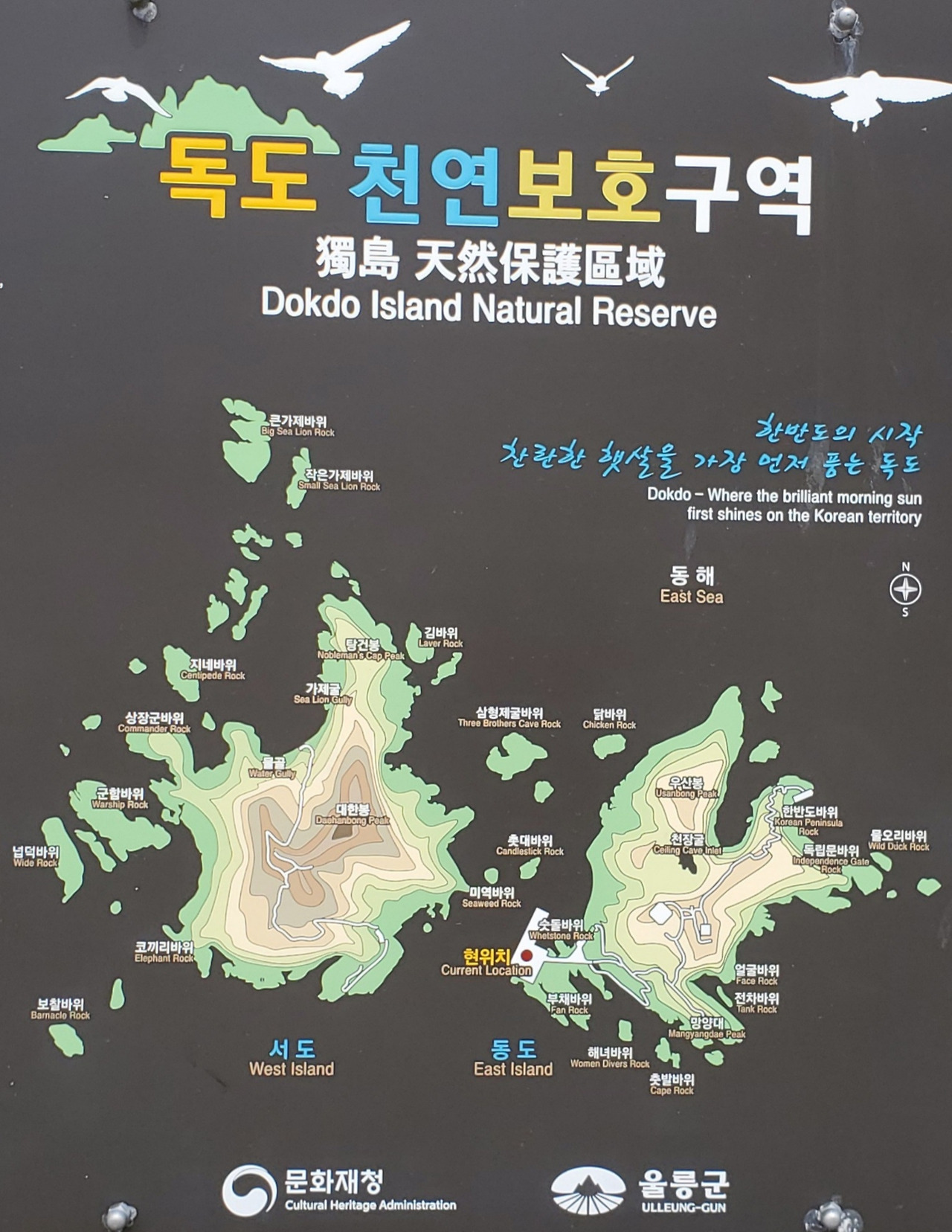 독도 도착을 20여 분 남겨 둔 시점에 선장님이 안내 방송을 했다. '독도 경비대원들은 간식이 부족하다. 혹시 경비대원에게 줄 위문품을 준비한 사람들은 경비대에 전해 주면 된다.' 독도에 접안할 수 있다는 확신이 드는 순간이었다. 잠시 후 배가 독도에 닿자 재빨리 내려 대한민국 동쪽 끝 땅이라는 표시판 앞에서 사진을 찍었다. 그리고 천천히 주변을 살펴보면서 아름다운 우리 강산을 사진에 담았다. 독도는 한반도의 시작, 찬란한 햇살을 가장 먼저 품는 곳이다.
