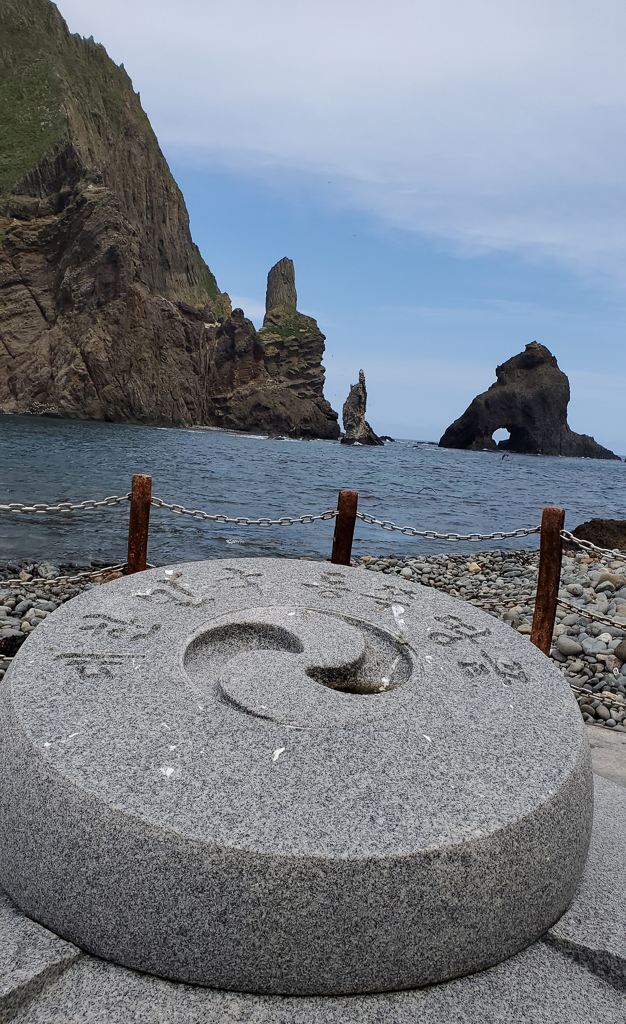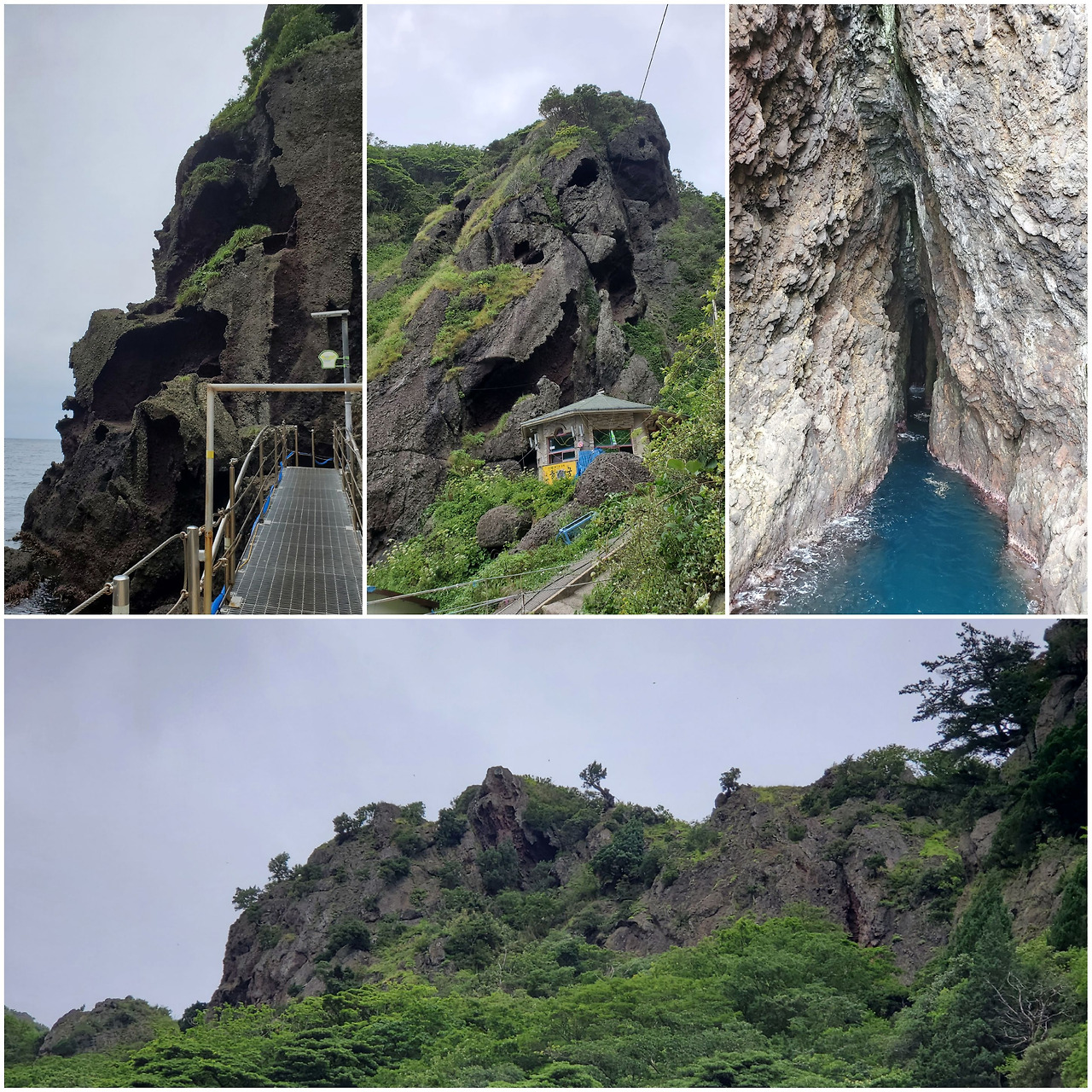 배도 꺼트릴 겸해서 도동 여객선 터미널 옥상을 거쳐 해안로를 걷기로 했다. 저동 촛대바위까지 약 1.2km 거리를 해안을 따라 좁은 트래킹로가 마련되었다. 꽤나 흥미로운 길이다. 꼬불꼬불 해안길을 따라가다 보면 층층이 다른 색깔과 다른 암석으로 구성된 화산암을 볼 수 있고, 퇴화되어 구멍이 숭숭 뚫린 절벽들을 만날 수 있다. 다리 밑으로 짙푸른 바닷물이 출렁거린다. 가족의 건강과 발복을 빌기 위해 돌을 층층이 쌓아 올린 돌탑 사이를 만선을 하고 돌아오는 배가 스쳐 갔다.