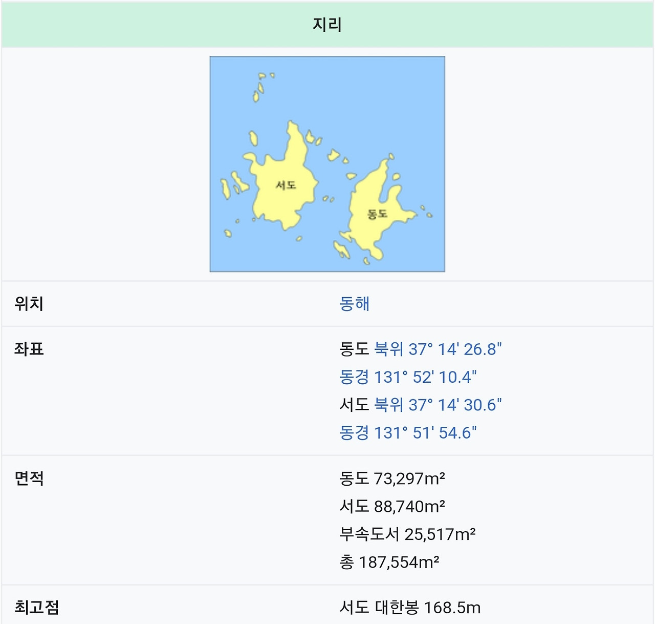 독도는 서도와 동도를 본섬으로 91개의 크고 작은 섬들로 구성되었다.