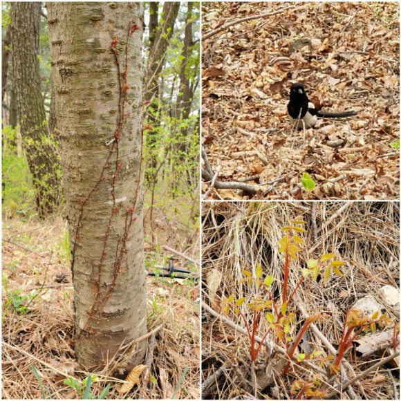 까치가 가랑잎 사이에 내려앉자 싱그러운 봄을 희롱거린다.