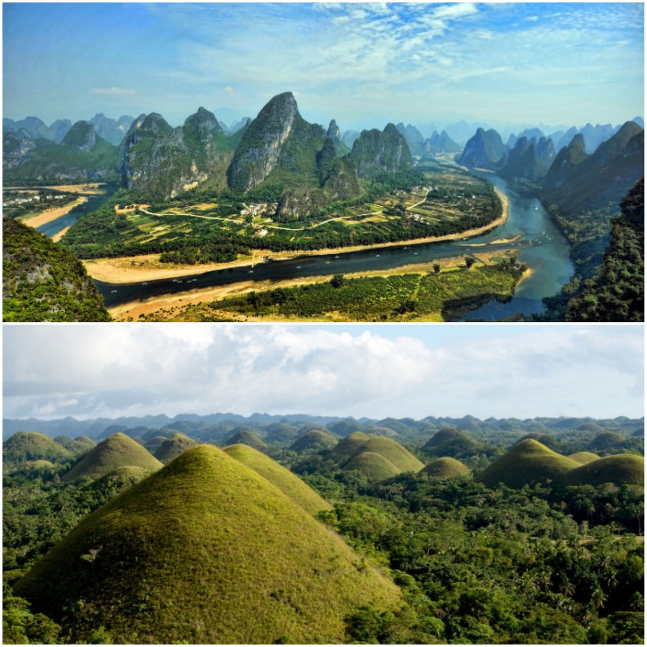 바다가 융기한 후 석회암이 녹아내려 만들어진 계림과 초콜릿 힐. 모양새가 너무도 다르다.