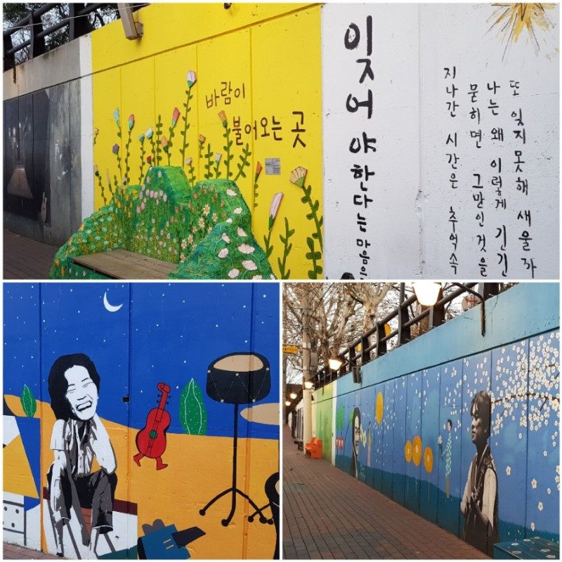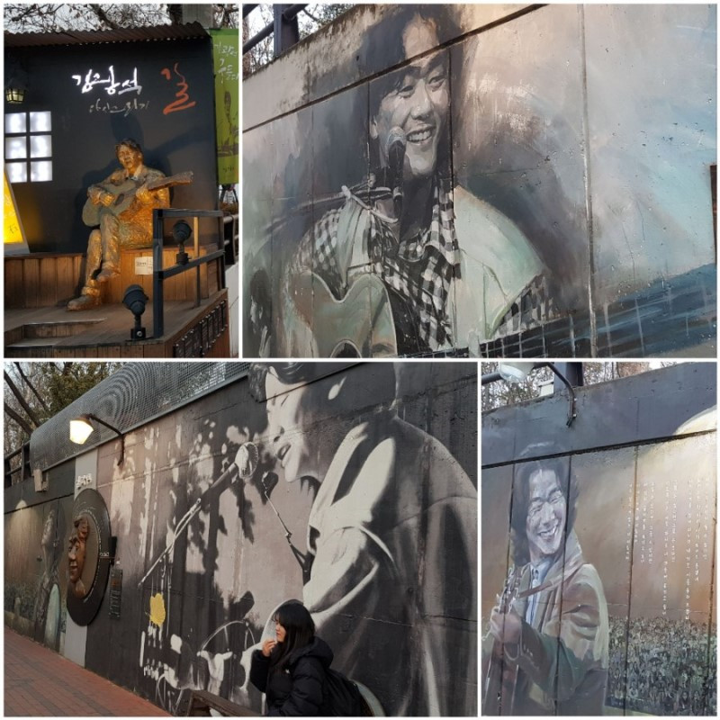 짝사랑을 그린 '사랑했지만', 이별의 '잊어야 한다는 마음으로', '너무 아픈 사랑은 사랑이 아니였음을', 군 입대하는 '이등병의 편지', 사랑하는 사람을 잊지 못할 때 '사랑이라는 이유로', 좌절을 극복하는 '일어나', 정의를 외치는 '광야에서', 또 '서른 즈음에', 인생의 황혼기를 노래한 '어느 60대 노부부의 이야기' 등 숱한 노래로 인생과 감성을 감미롭게 표현했다. 그의 노래는 우수에 차고 외로움이 담겨 있다. 나도 젊었을 적 한순간 그의 노래를 듣다가 눈물을 지었던 기억이 있다. 지금도 매년 그를 기억하는 사람들이 모여 '김광석 노래 부르기' 행사를 한다. 뮤지컬 '바람이 불어오는 곳'은 김광석의 사랑과 꿈과 우정을 노래한다. 김광석의 거리에 들려 그의 시와 노래를 들으며 내 어릴 적 아픔과 사랑과 그리움을 떠 올려 보는 것도 좋겠다. 잠시 정화되는 느낌을 받을 수 있다.