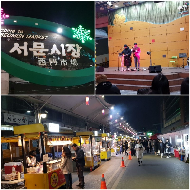 청라언덕을 내려와 길 하나 건너면 바로 서문시장이다. 서문시장에 대한 최초의 나의 기억은 경북대학교에 입학과 관련된다. 아버지께서 서문시장에 함께 오셔서 객지에서 자취할 자식을 위해 이불을 한 채 구매하시고, 돼지국밥을 사 주셨다. 그때 처음 돼지국밥을 먹어 봤다. 그리고 대학을 다니면서 틈틈이 서문시장을 스쳐 지났다. 대학시절 가벼운 주머니로 갈 수 있었던 곳은 대구백화점 뒤 막걸리 집과 서문시장 내 붕장어 대가리와 껍질을 연탄불로 구워 파는 막걸리 집이었다. 2천 원에 붕장어 대가리 열개. 구수하고 맛났던 그 옛적 서문시장이 이젠 현대화되어 야간에도 불을 환하게 밝히고 있다. 야시장을 찾은 젊은이들이 버스킹 노래를 들으며, 포장마차 앞에 줄을 서서 거리 음식을 사 먹고 있다. 비주얼로 식감을 자극하는 퓨전 음식들이 젊은 데이트 족을 유혹한다. 전통시장이 이제는 관광장소로, 데이트 장소로 이용된다.
