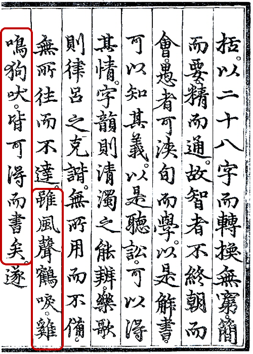 김슬옹(2013). 『훈민정음(해례본)』의 정인지 '서문' 표준 공역 시안. 청람어문교육학회, 2013/01 학술대회 자료집. (원본 내용은 “雖風聲鶴唳雞鳴狗吠, 皆可得而書矣”입니다.)
