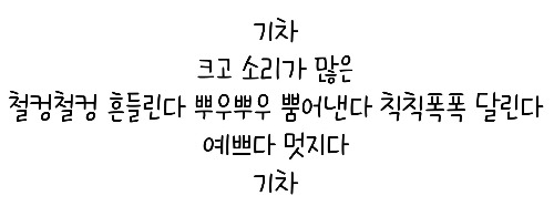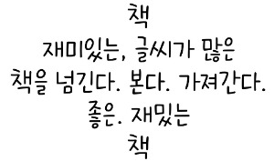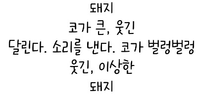 다만 여기에서는 이야기 구조를 익히는 게 목적이기도 하고, 나이 어린아이들에게는 어려울 수도 있어서 5줄로 축소했고 반의어, 동의어 구조가 아니라 싱케인과 같은 구조를 택해서 다음과 같이 변형해 보았습니다.