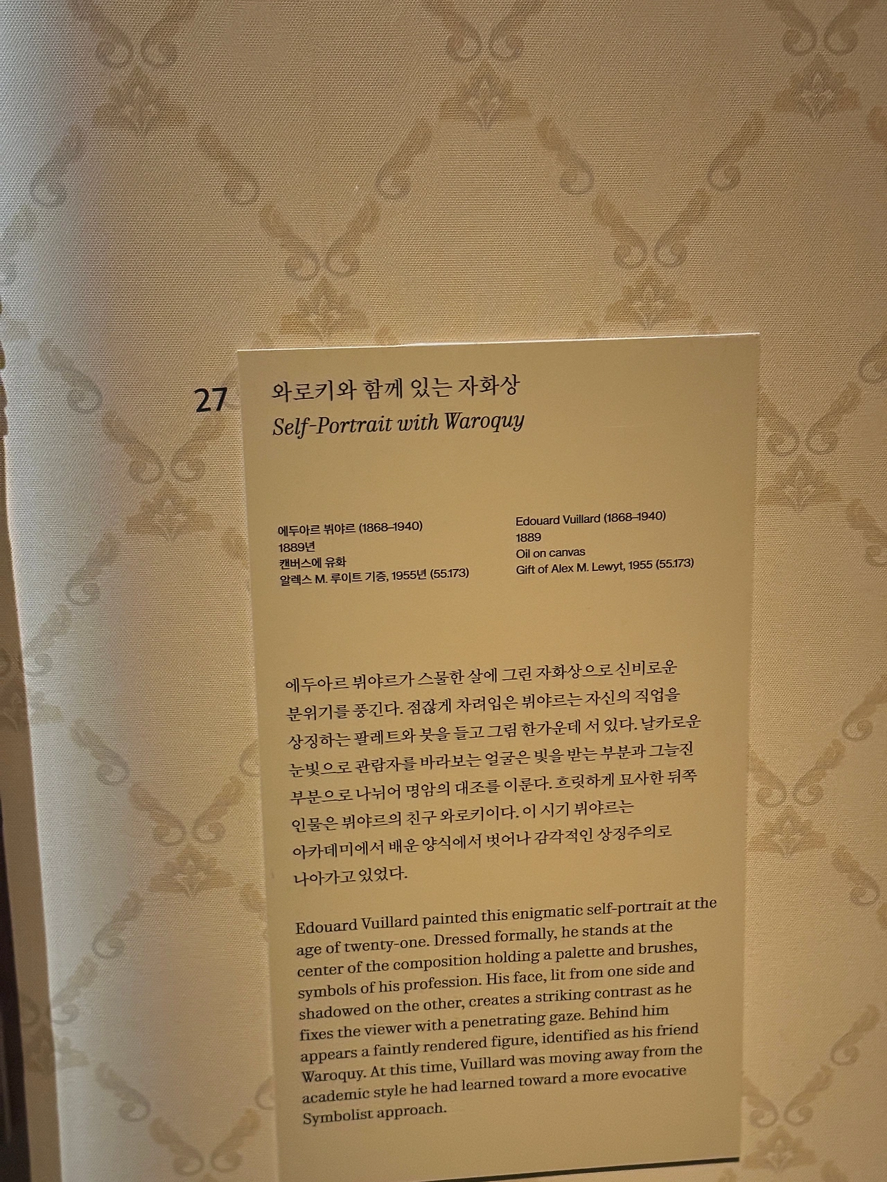 81점이라는 엄청 많은 그림이 있었지만 세션을 너무 세분화하기도 했고 제목과 연결되지 않아서 그림을 기억하기 어려웠다. 특히 중간쯤에 노란색 벽지로 꾸며진 '에두아르 뷔야르' 작품으로만 전시된 방이 있었는데, 벽보에는 어떠한 정보도 없었다.
