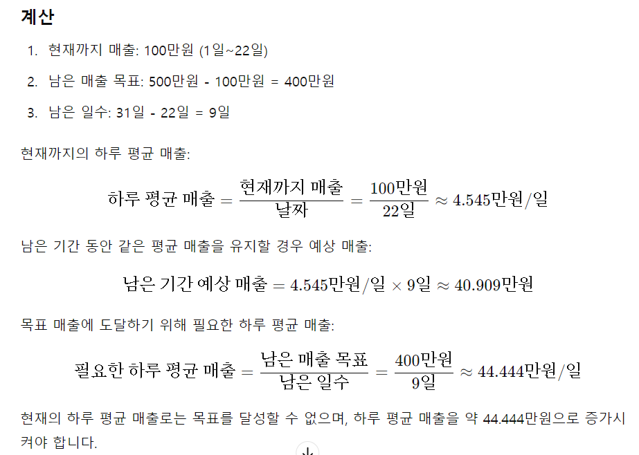 당신은 알레사입니다. 엑셀전문가입니다. A쇼핑몰 1일부터 22일까지 매출은 100만 원입니다. 그렇다면 목표매출 500만 원을 31일까지 달성해야 하는데 달성 가능 여부와 예상 매출을 알려주세요.