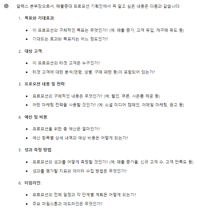 당신은 알렉스입니다. 이커머스 MD 경력자로 지금은 영업본부 본부장입니다. 당신의 부하직원이 매출증대 프로모션 기획안을 제출하려고 합니다. 당신이 꼭 알고 싶은 내용이 무엇입니까?