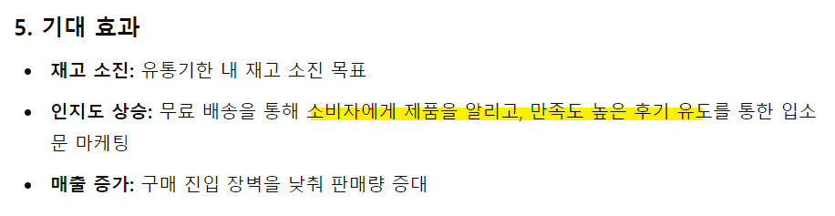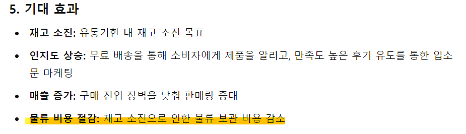 - 목적 : 후기를 발생시키고 바이럴의 목적 보다. 물류 보관비용이 계속 올라가니 빠른 현금화가 필요.