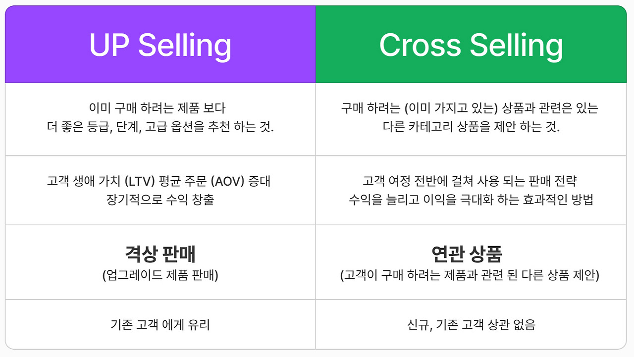 둘 다 매출을 증대시키는 방법은 동일하지만, 업셀링은 고객 1명이 결제하는 금액 (AOV) 이 높아진다.