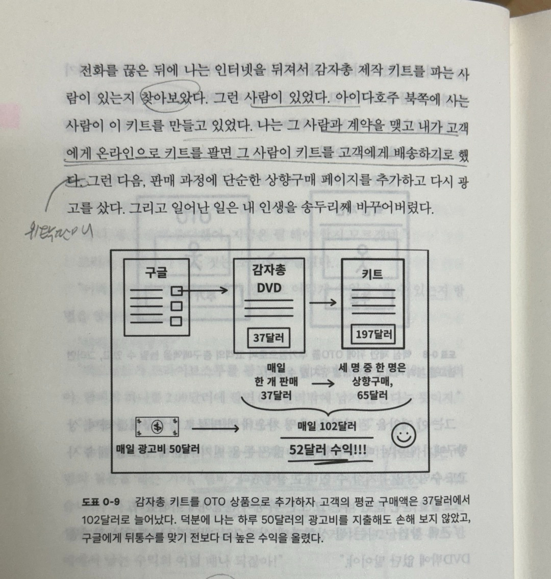 감자총 DVD 만 판매했더니, 구글 CPC 광고 비용이 증가해서 수익이 떨어졌다. 맥도널드 세트 판매에 아이디어를 얻어 감자총키트를 만들 수 있는 사람을 찾아 키트를 구했다. DVD를 구매한 사람 한데 상향 판매 페이지로 제안했더니 구매가 이루어짐. 판매 단가가 올라가서 수익이 개선되었다는 것.