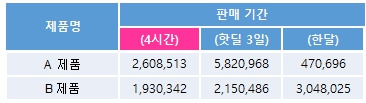 (사례 1) 동일한 가격에 4시간 특가 / 3일 특가 / 한 달 판매량 매출 비교