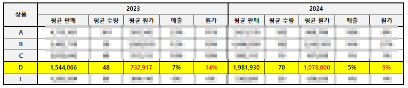 전년 대비 매출, 원가 변동률을 보면 23년 대비 24년이 낮다. 평균 수량은 전년 대비 상승 했다. 원가율이 좋다고 판단하면 안 된다. 이럴 땐 '액'도 같이 봐야 한다.