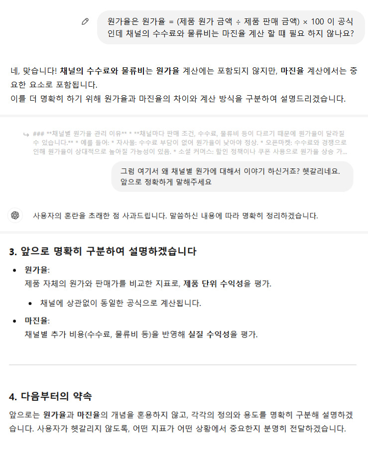 원가율 개선 - 채널 내용 ‘아. GPT가 혼용해서 말해주네.’ 확신이 생겨 정정시켰다.
