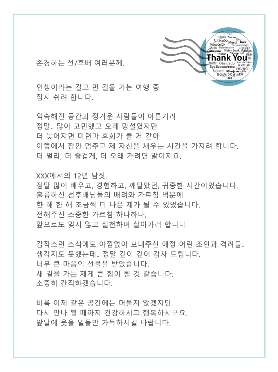 퇴사를 결심하고 회사 선후배님들께 보냈던