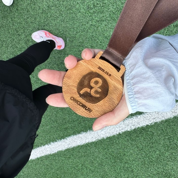 그리고 어느새 출발 했던 지점으로 돌아오고 있었다. 사람들이 경기를 끝마치고 하나 둘 줄을 서서 메달을 받고 있었다. 그들의 옆을 스쳐 지나갔다. 결승 지점을 통화하고 나니 눈물이 살짝 맺혔다. 내가 이걸 해내다니 말이다. 나는 결승선에서 사진을 몇 번 찍고, 결승 메달을 받는 줄에 섰다. 나의 첫 러닝 대회 메달이다. 나무로 만들어진 메달과 함께 각종 기념품을 선물 받았다. 너무 목이 말라 거기 안에 들어있는 두유를 벌컥벌컥 들이켰다. 사실 엄청 땀을 흘린 것은 아니지만 말이다. 등산을 더 많이 한 것 같은 온코런 러닝 대회. 내 인상 첫 러닝 대회였다.