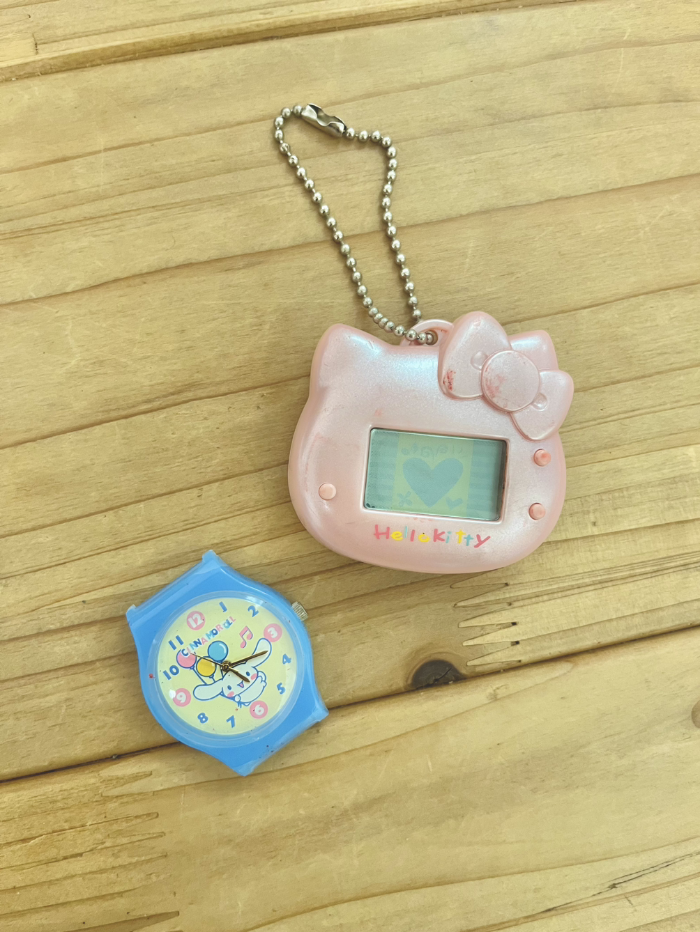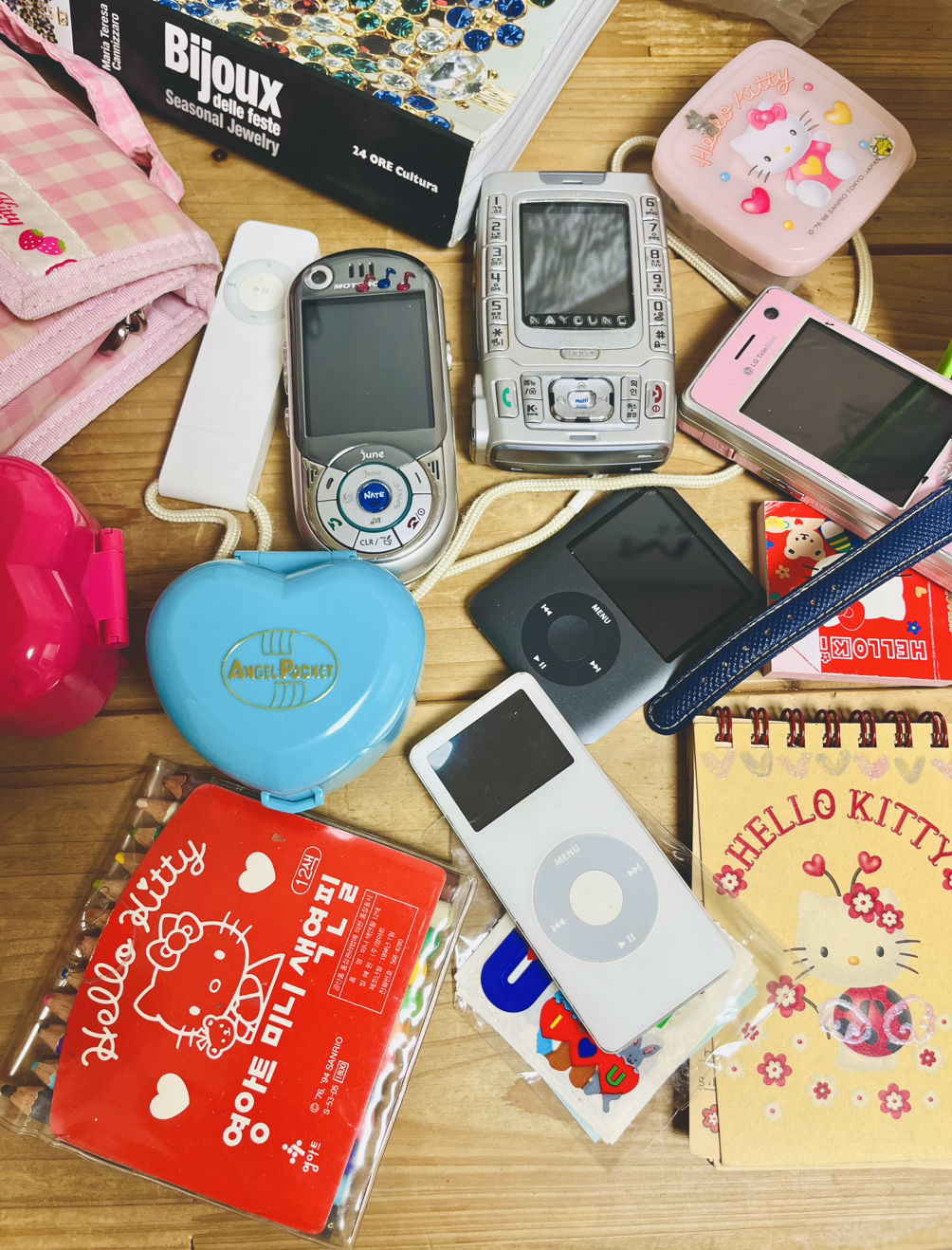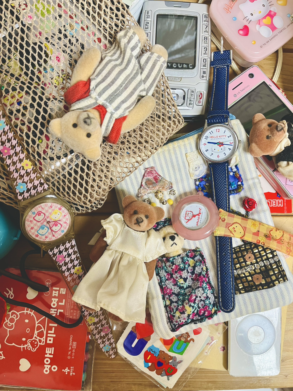 세 번째는 내 기준 제일 하이라이트라 별표 백 개를 쳤다. 바로 옛날 오래된 물건이나 추억의 물건을 갖고 오는 것이었다. '이건 내 전문이지.' 꼬꼬마 시절부터 덕후, 덕질, 수집광이라는 명사에 잘 어울렸던 나였다. 이야기를 더하고 의미를 부여한 것은 작고 하찮은 것이라도 일단 모으고 봤다. 놀이공원 티켓, 기념우표나 스티커, 영수증, 영화 팸플릿 하다못해 도넛을 살 때 트레이에 까는 종이가 특별하게 이뻐서 가져와 모으곤 했다. 크면서 대다수 정리하긴 했지만 그래도 믿을 구석이 있었다. 아빠 집에 가서 내 보물 상자들을 엎어놓고 열심히 뒤졌다. 일단 목표는 두 가지. 워크맨 카세트를 지나 잔뜩 붙인 스티커로 취향을 뽐낸 CD 플레이어와 생일 선물로 받은 키티 체크 패턴 손목시계. 그 두 개를 제일 찾고 싶었는데 어디 있는지 한참을 뒤적여도 보이질 않아 끝내 포기했다. 그래도 고운 분홍색 키티 크로스백이랑 디즈니 프린세스 액자를 건져왔다. 집에 돌아와 혹시나 하는 마음에 상자를 엎고 난리 쳤는데 찾던 두 가지가 여기 가까이 있었다. 그 외에도 폴리포켓, 맥도널드 해피밀을 먹고 받은 테디베어, 바비 인형, 키티 수첩, 미니 색연필, 아이팟 시리즈, 2g 핸드폰 등 내가 살아온 서사가 담긴 아이들을 엄선해서 골랐다.