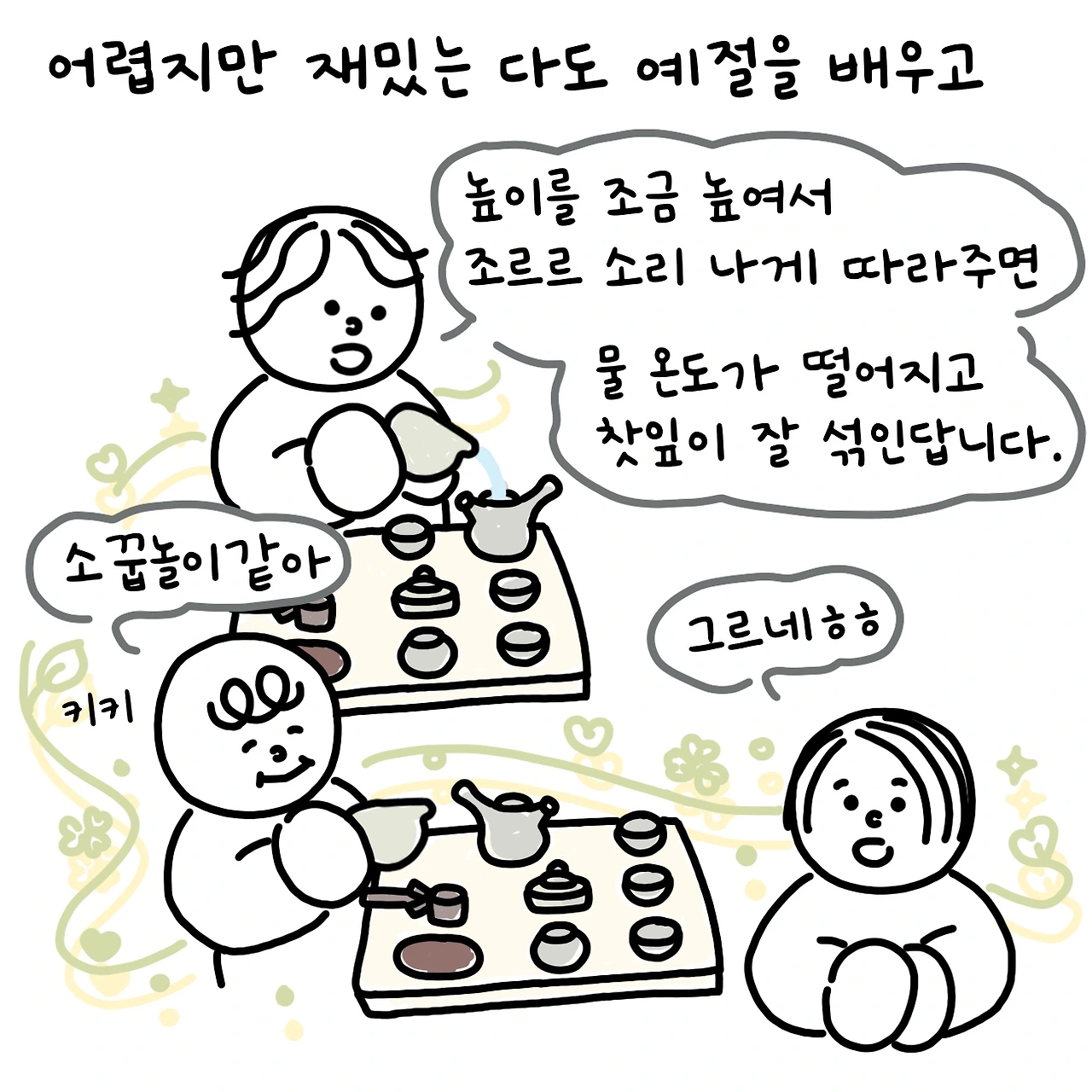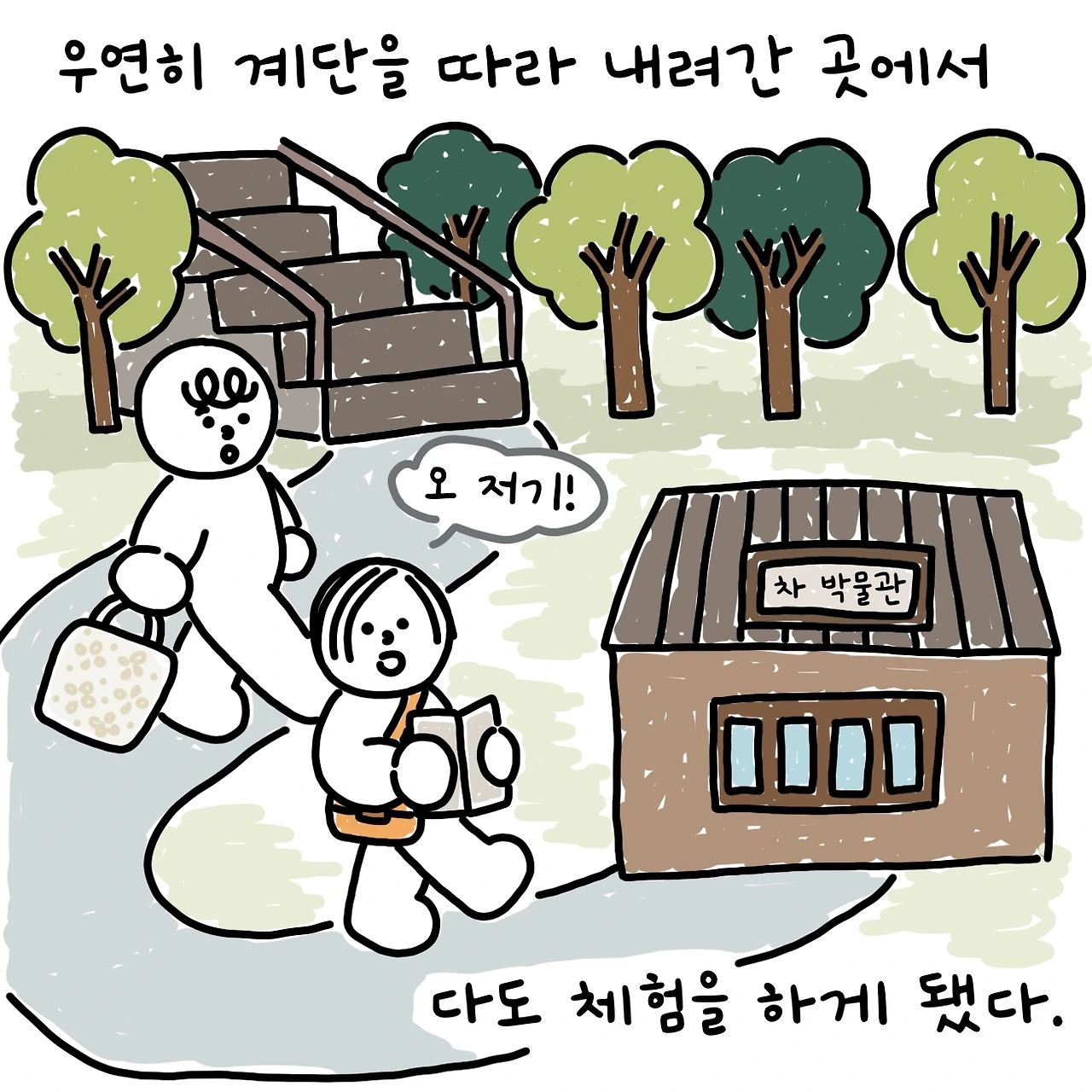 사람이나 여행지나 첫인상, 첫 이미지가 앞으로의 관계를 결정짓는 중요한 안건이 되곤 하는데 첫 느낌의 하동은 은은하게 싱그럽고 다사로웠다. 동네 걷는 길 족족 초록으로 물든 차밭이어서 그런 걸까. 우연히 발 닿은 곳에서 다도를 알려준 선생님의 몸에 스며든 배려가 감사해서일까. 다도 체험이 끝나고도 나의 단순 무구한 호기심 배인 질문들에 선생님은 차분하고 세세하게 알려주셨다.