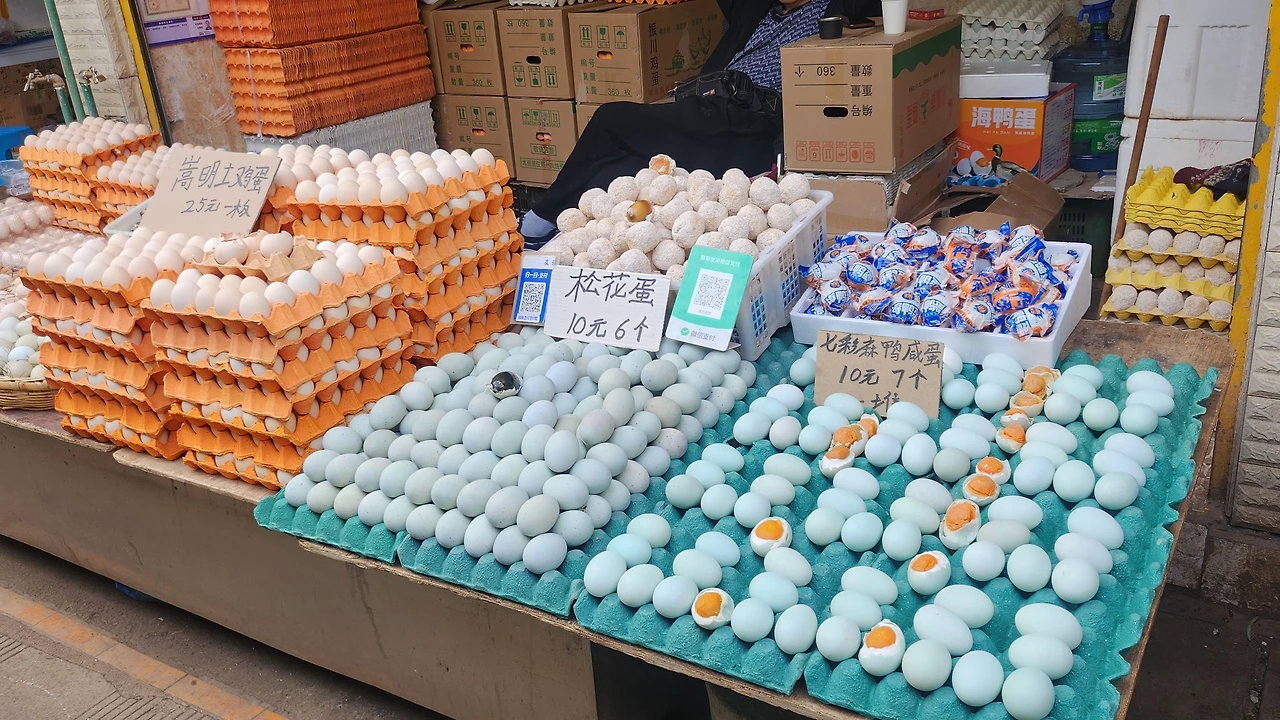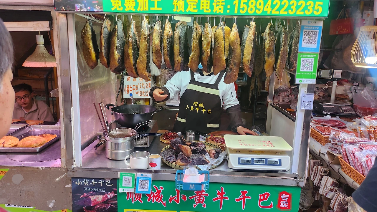 대관신농산물시장은 떡부터 케이크, 니 우간 빠(牛干巴, 육포), 가지구이, 닭발 등 여기저기 입맛을 돋우는 음식 천국이다.