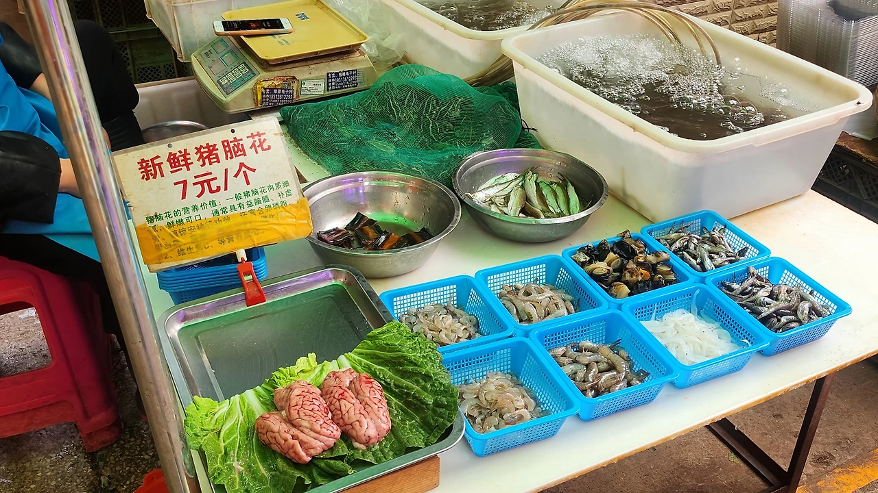 형태를 그대로 보존해서 넋 놓고 구경했던 돼지 뇌. 하나 당 7위안. (한국 돈으로 1500-1600원)