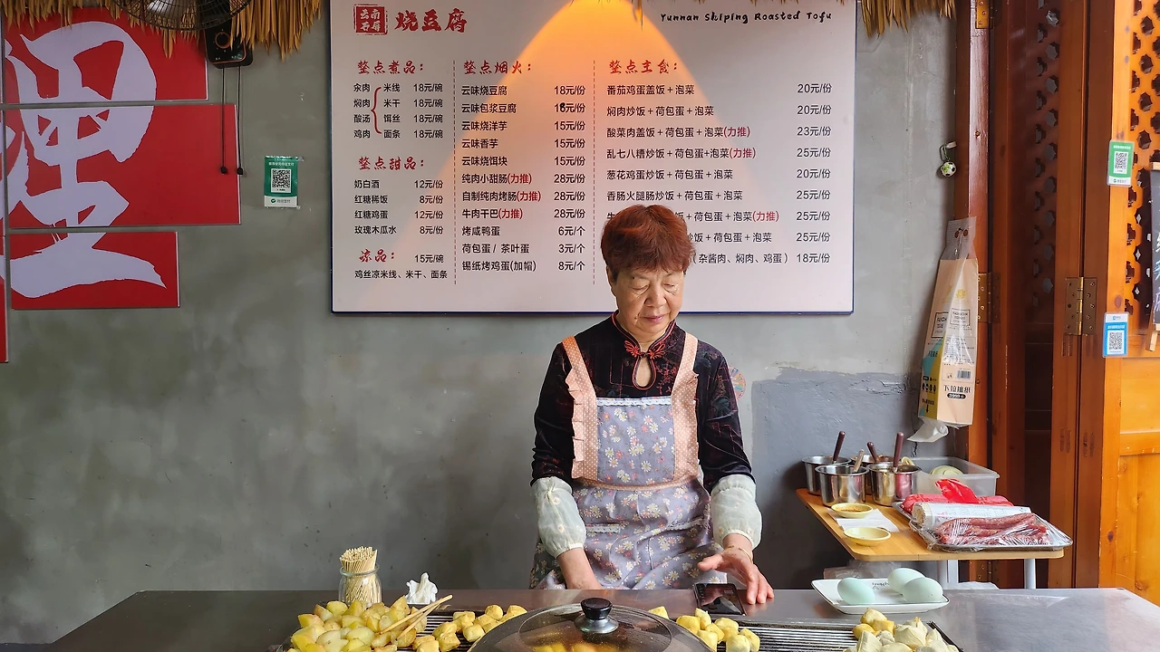 윈난에서 꼭 먹어봐야 한다는 ‘두부 구이’. 형태도 조리법도 다양하다. 이 음식은 겉은 풍선 질감으로 쫀쫀한데 속은 부드럽게 씹힌다. 아주머니는 은은한 미소로 먹는 법을 알려준다. 두 손으로 반으로 쪼개서 양념장에 톡톡. 한두 개 입에 쏙쏙 넣다 보니 무려 열두 알이나 먹었다.