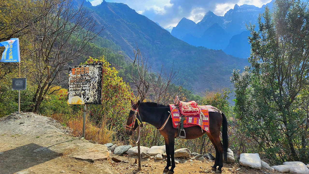 새벽 공기를 가르며 숙소 주인이 잡아 준 택시를 타고 호도협(虎跳峡, 후티아오샤)의 입구인 상호도협(上虎跳)에 도착했다. 막상 마주한 장엄한 산세에 살짝 겁이 났다. 동네 산도 제대로 못 타는 내가 여기서 홀로 1박 2일 트레킹이라니? 그래도 물러나는 대신 신발끈을 꽉 조여 맸다. 여기까지 씩씩하게 왔으니 매듭은 짓고 가야겠지. 옆을 지나는 말들이 힘내라는 듯 힘차게 푸르릉 소리를 냈다.