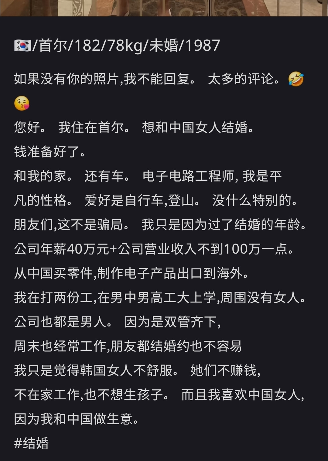 샤오홍슈(小红书, 중국판 인스타그램)에서도 자기네 나라 이성이 싫다며 자신과 결혼해 줄 중국 남녀를 찾는 한국인 게시글이 이따금 이슈가 되곤 해."