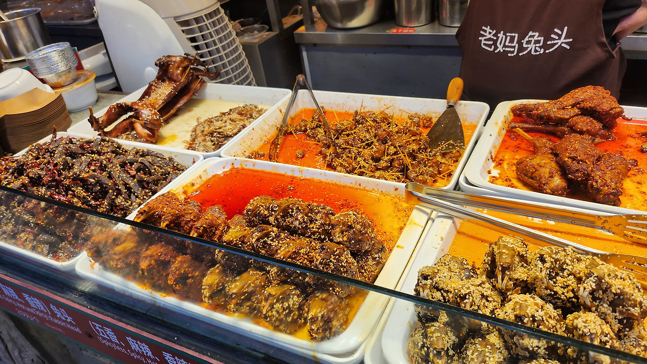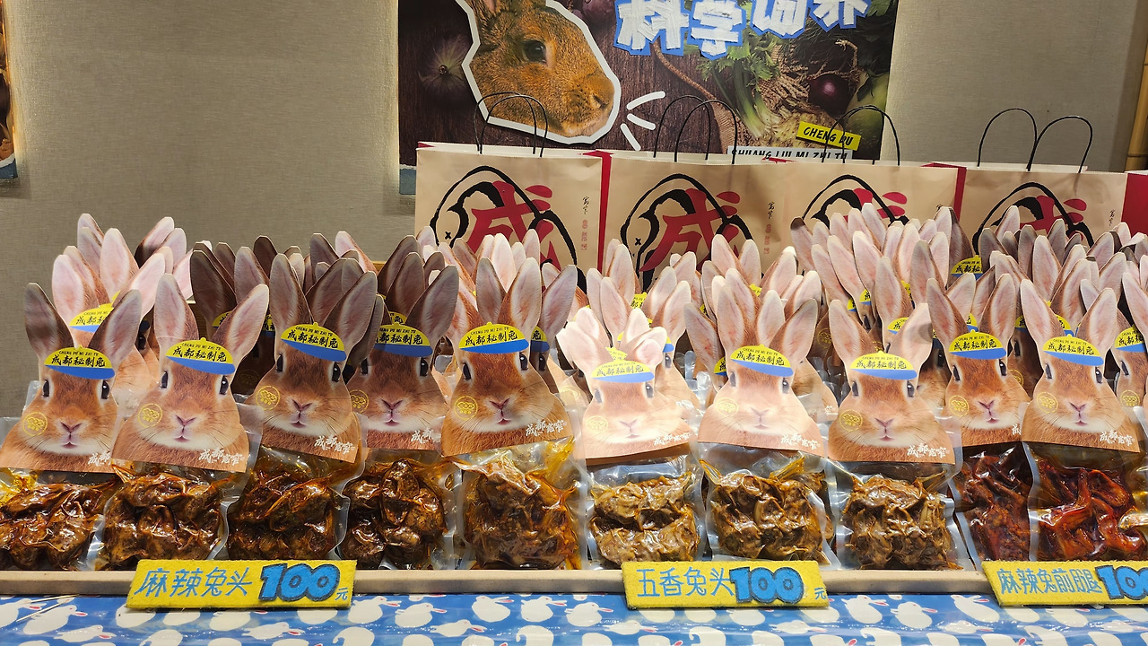 "제발, 음식이라고 말하지 마." 토끼머리, 토끼 몸통, 토끼 다리. 마라향 폴폴 나는 청두의 대표 별미다. 시식용 고기는 잘게 잘려 원형을 알 수 없다. 다만 머리는 귀만 뗀 채 그대로 팔린다. 점심을 거른 허기가 단번에 사라진다.